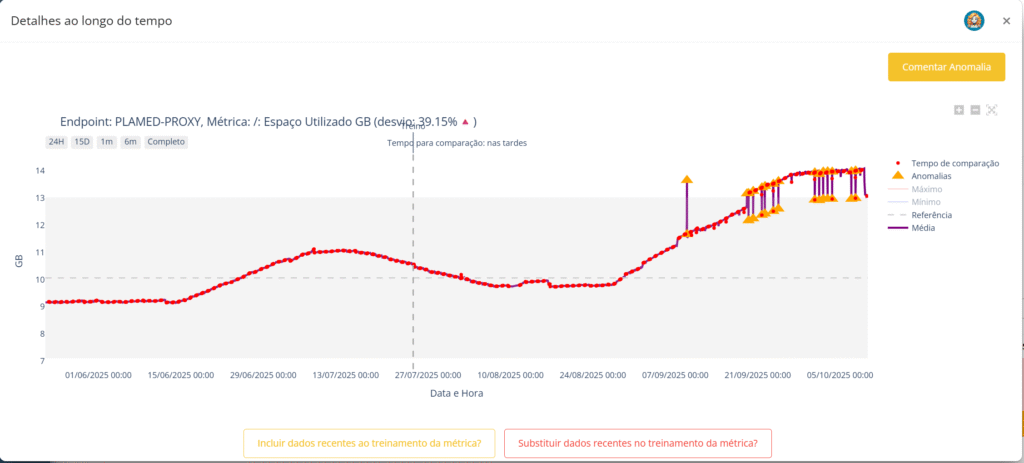 Utilizando modelos treinados com inteligência artificial, o sistema identifica desvios em relação ao comportamento histórico das métricas, analisando curva, tendência, contexto e impacto real no ambiente.