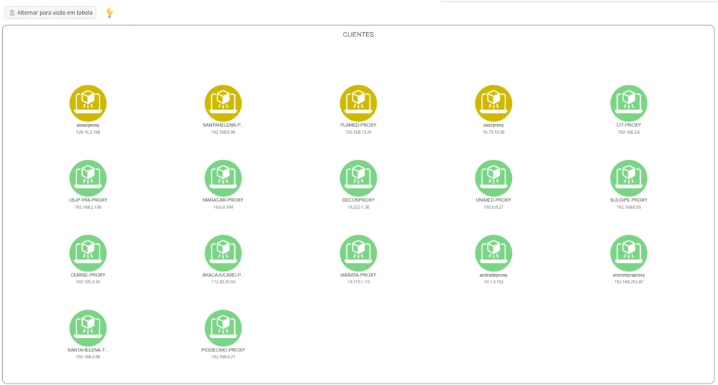 O painel permite visualizar todos os endpoints agrupados por clientes, unidades, ambientes ou projetos — conforme configuração feita nos Grupos de Endpoints.