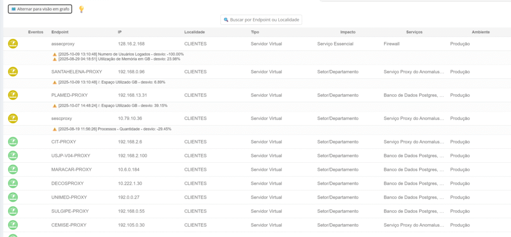 O objetivo do Mapa de Eventos é oferecer uma visualização consolidada, centralizada e em tempo real de todos os endpoints críticos da infraestrutura, destacando: