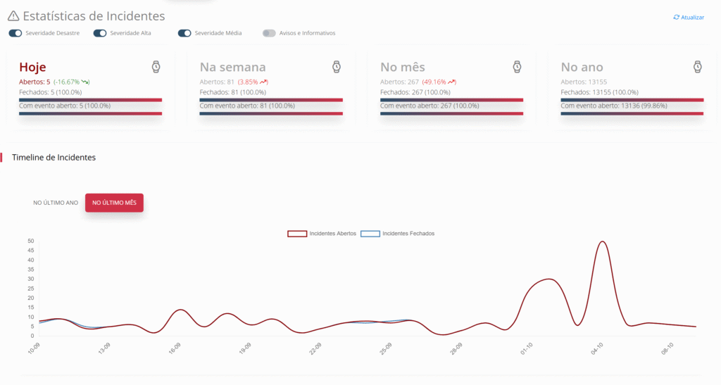 O gráfico de Timeline de Incidentes mostra, de forma cronológica, os volumes de incidentes abertos e fechados diariamente no período selecionado (último mês ou último ano). É ideal para: