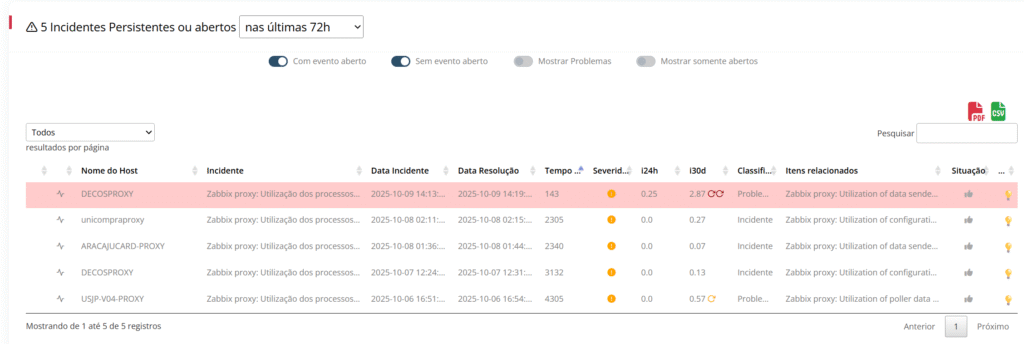 A lista de incidentes persistentes ou ainda não resolvidos exibe: